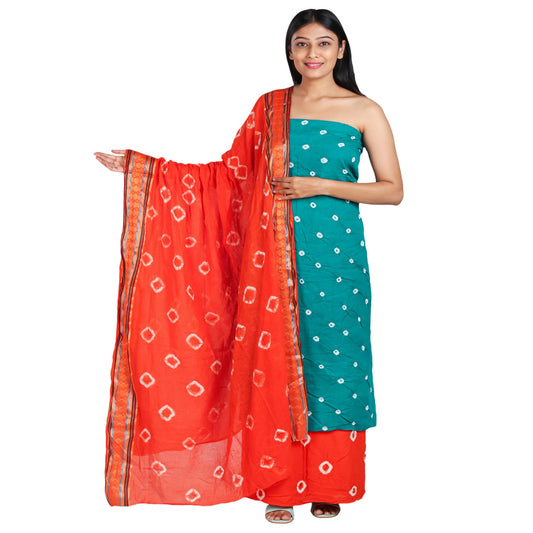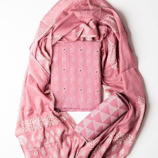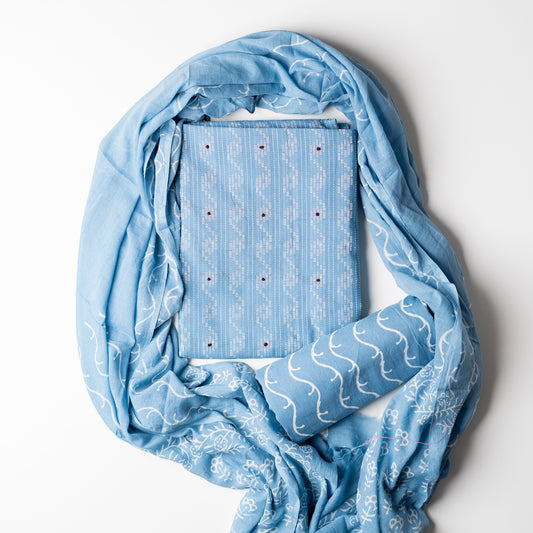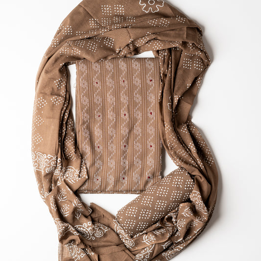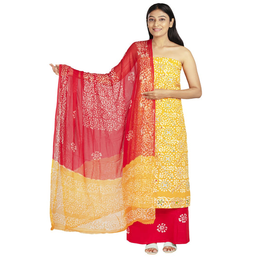 Yellow Cotton Batik Embroidered Dress Material with Chiffon Dupatta