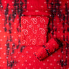 Cotton Bandhej Dress Material, Red color top with white bandhej designs, red color bottom with shibori designs in black. Red color dupatta with shibori designs in black color and golden borders.