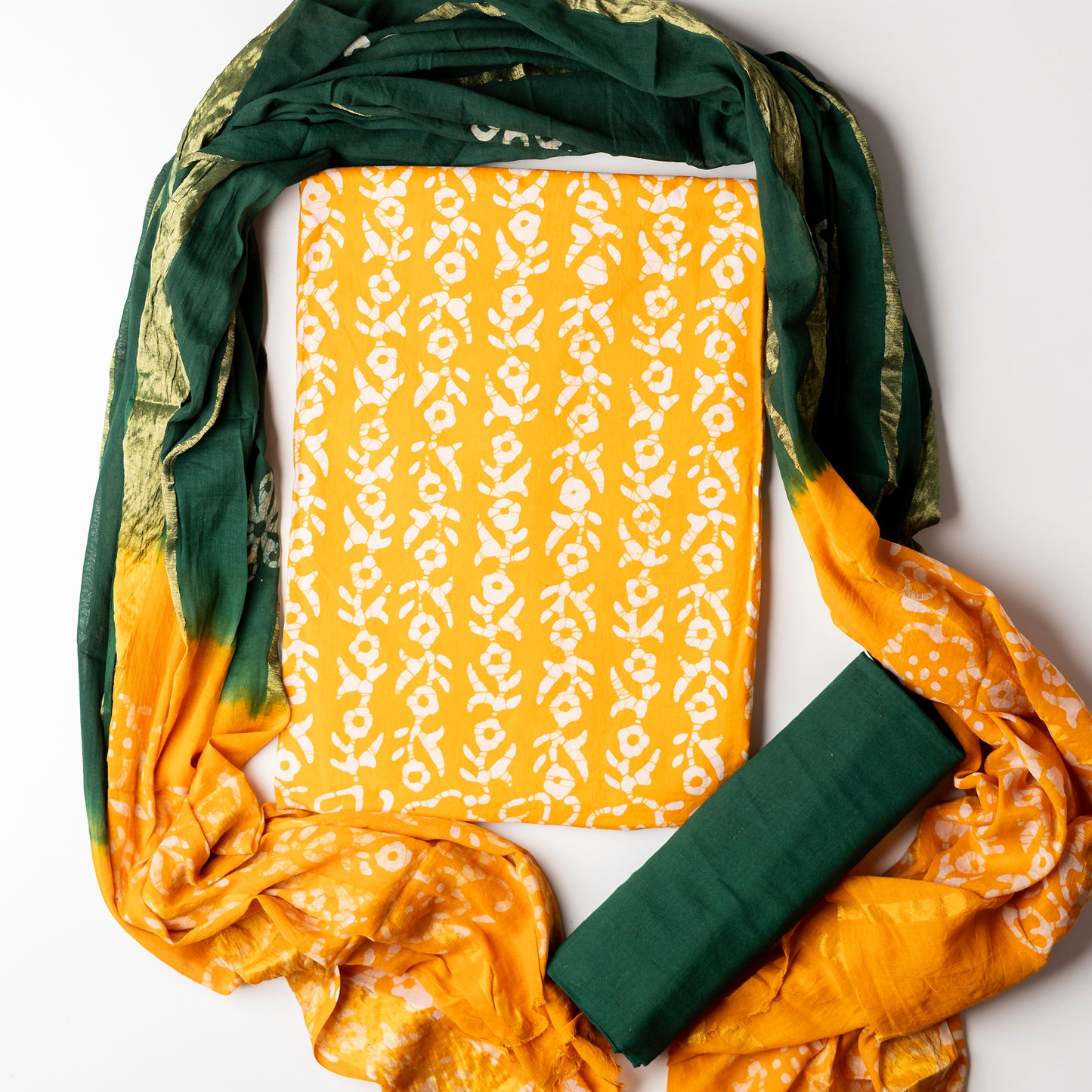 Yellow color cotton wax batik dress material with white prints, cotton green color bottom with batik prints. Cotton green and yellow color dupatta with golden color lines in between and wax batik prints.