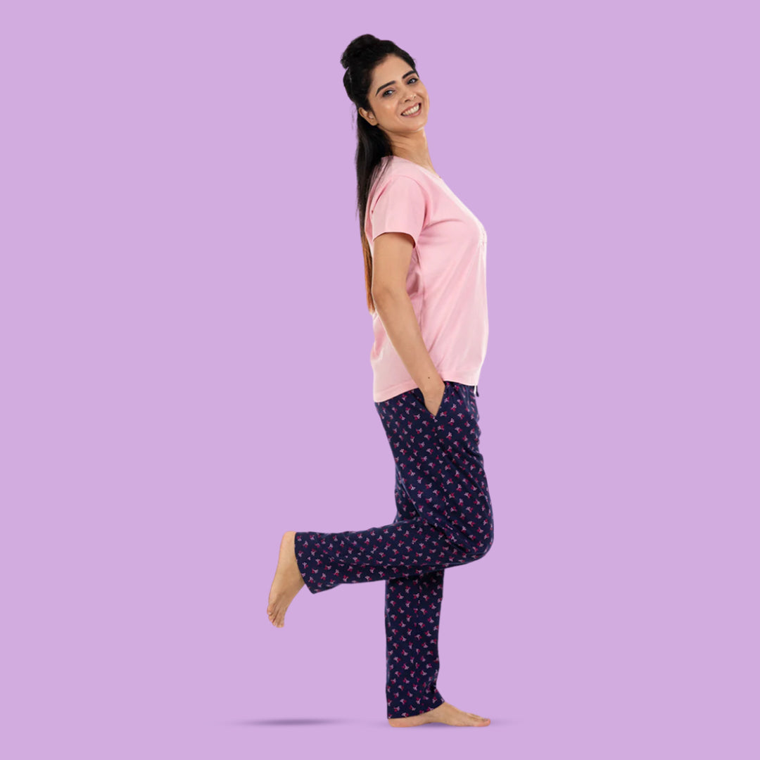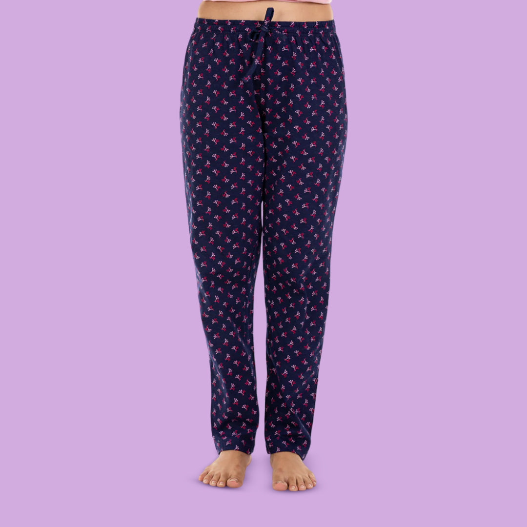 Get this elegant looking navy blue color pajama with multi-colour shell prints
