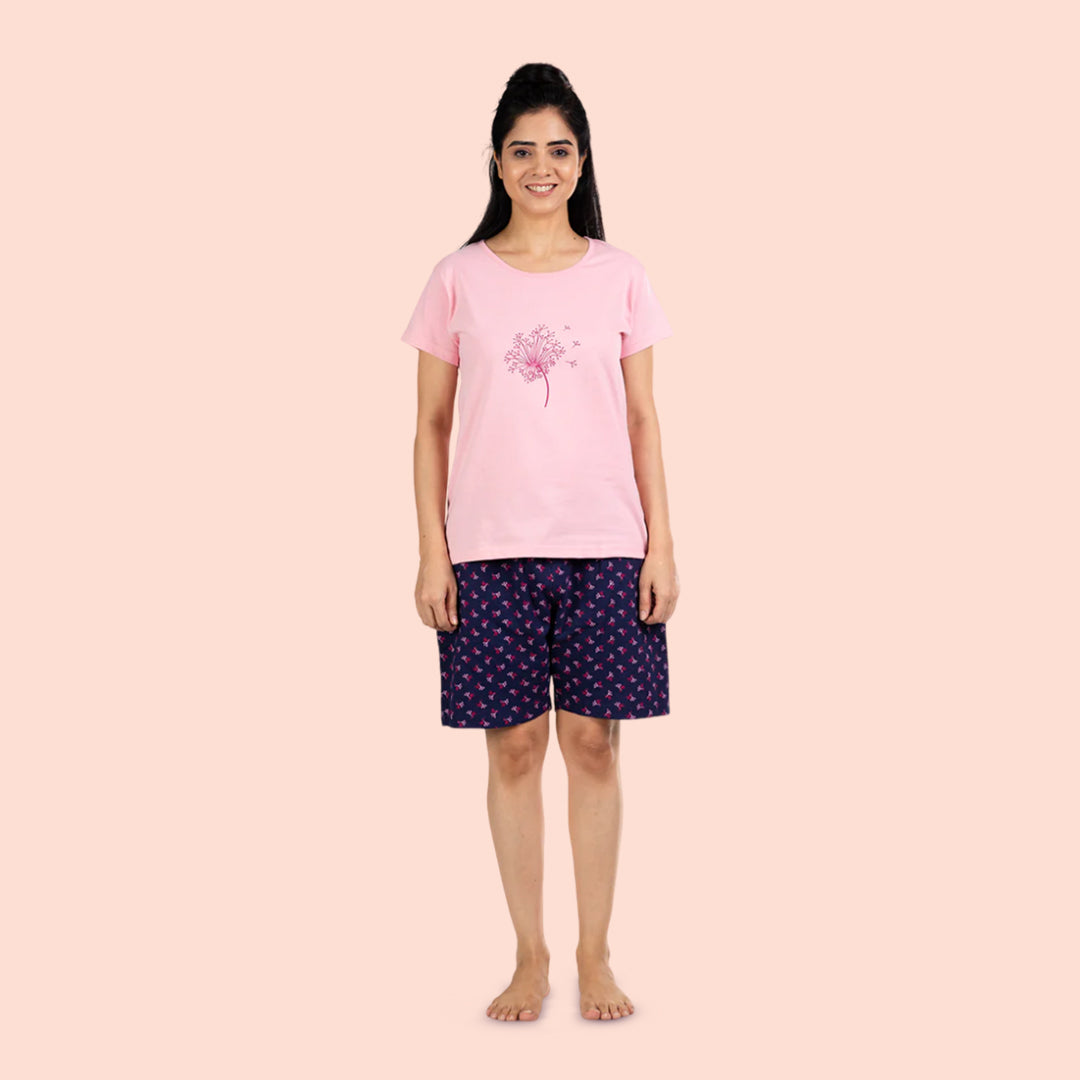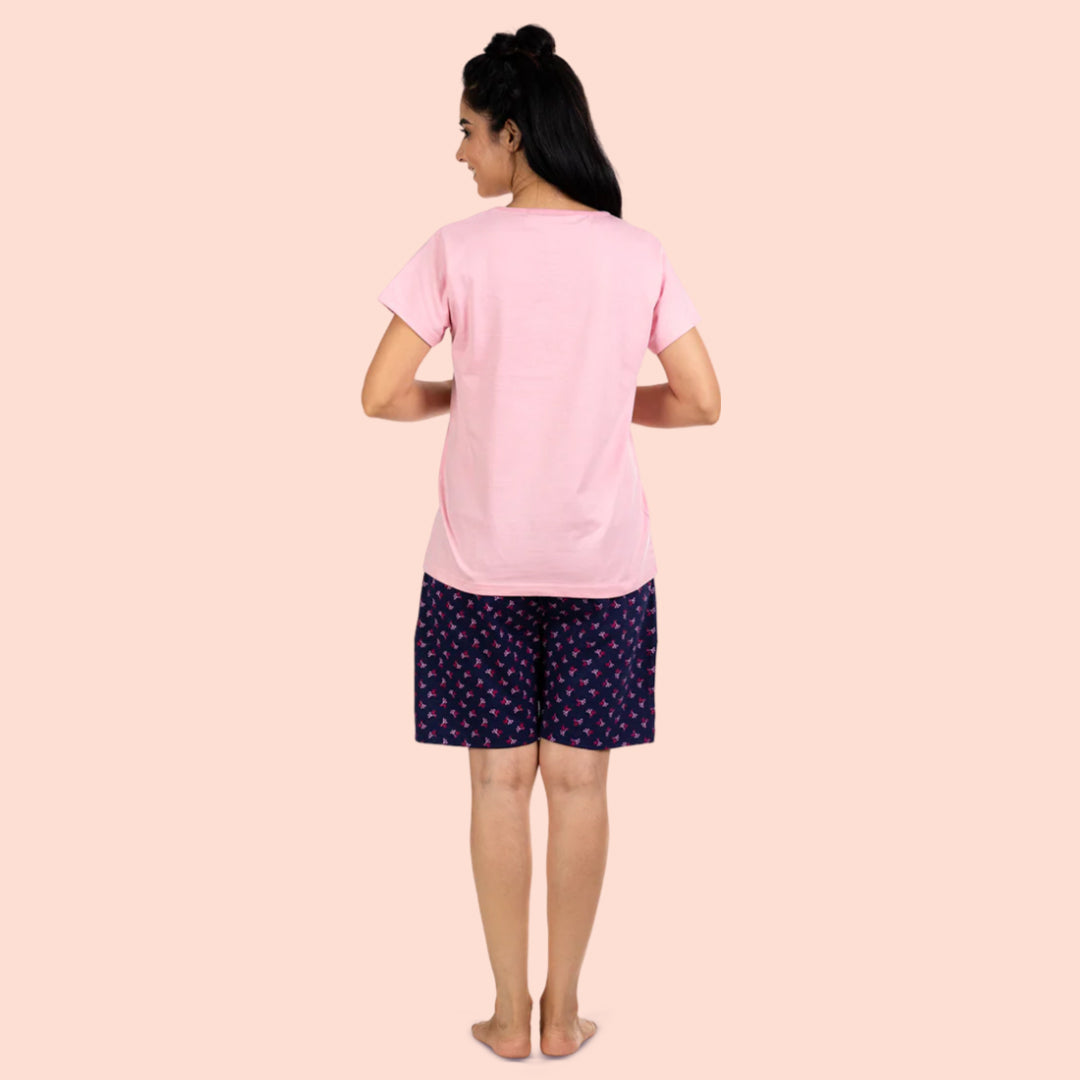Cotton Printed Night Shorts Set - Light Pink & Navy