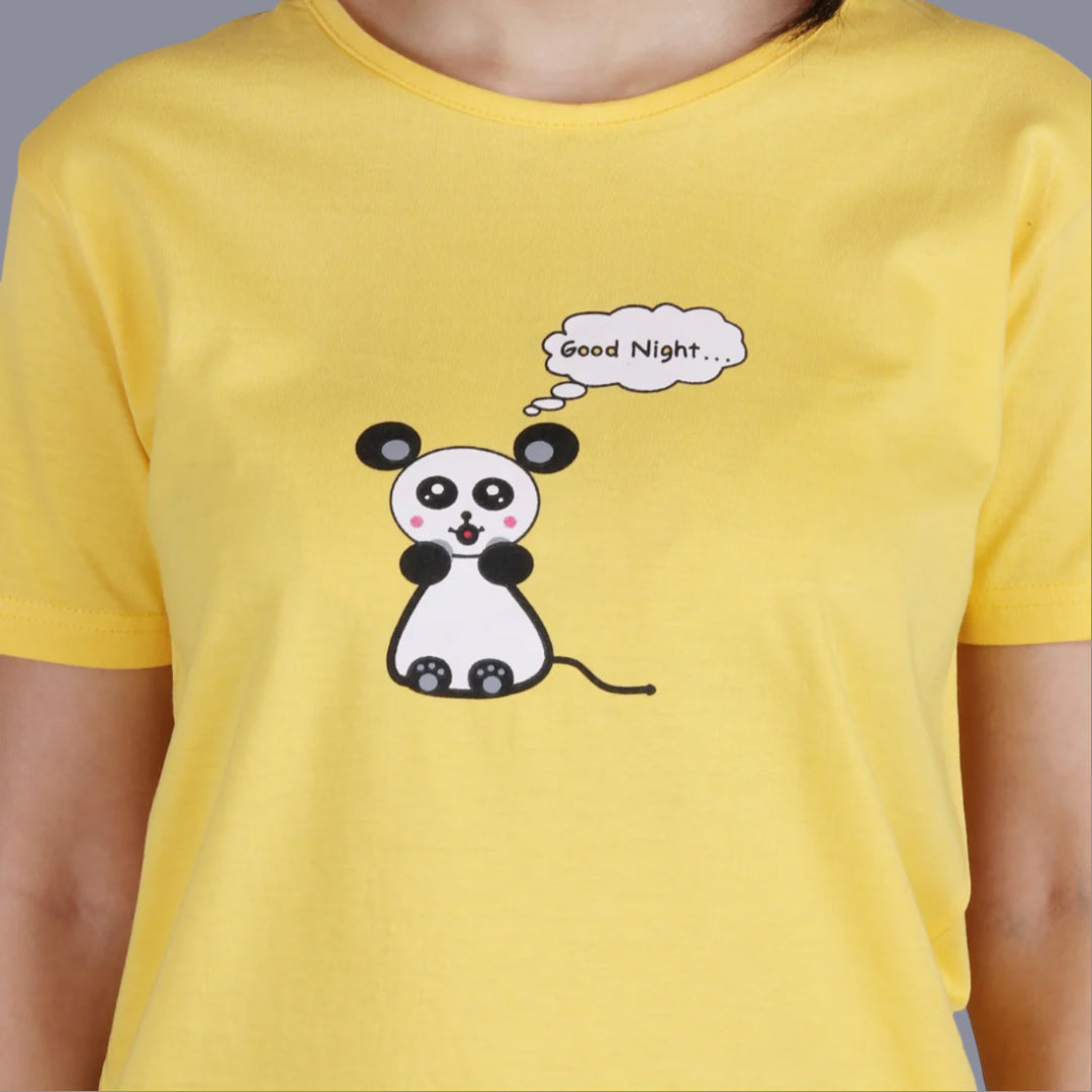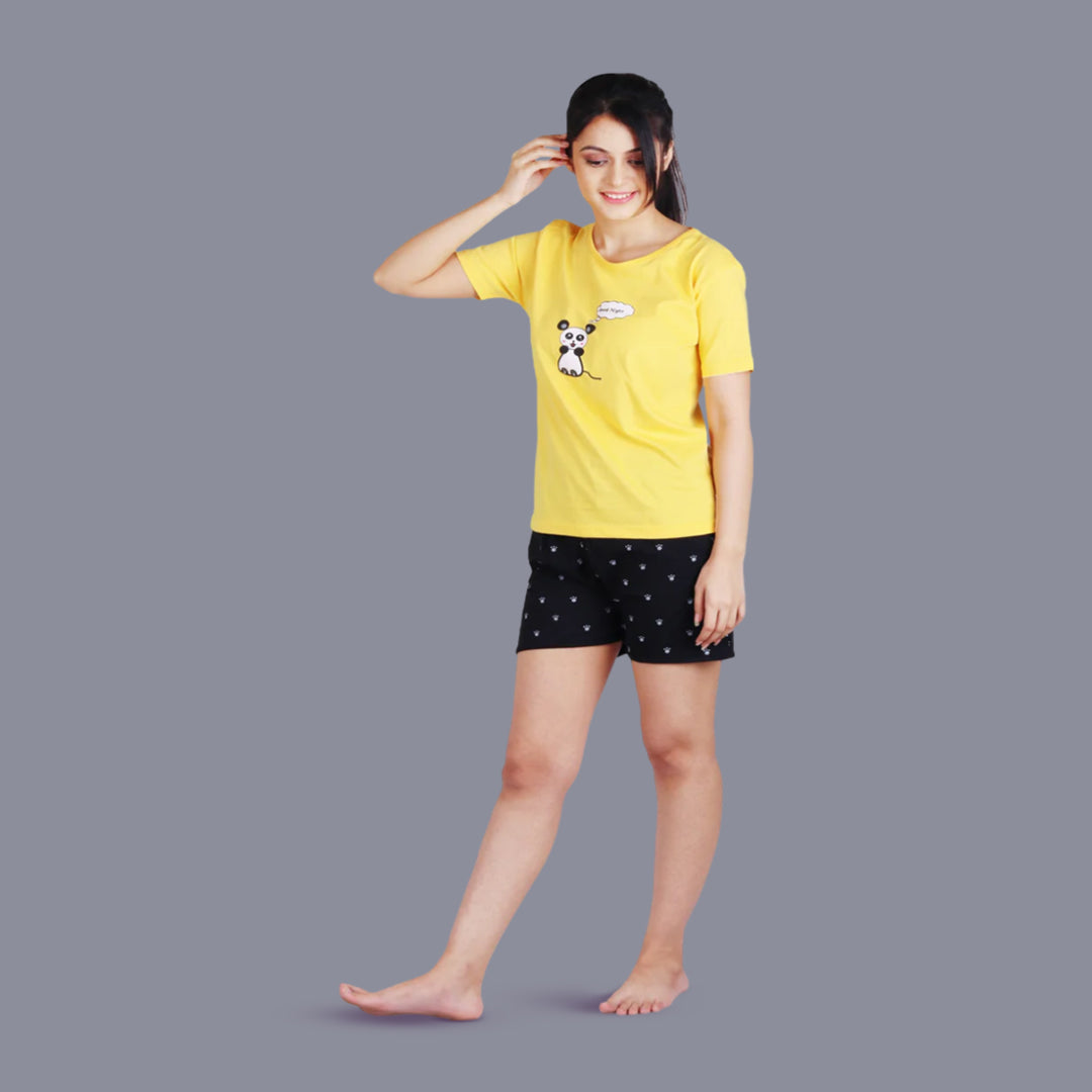 A comfortably perfect lounge wear t-shirt and mini shorts set ideal for Sleep and Picnic.